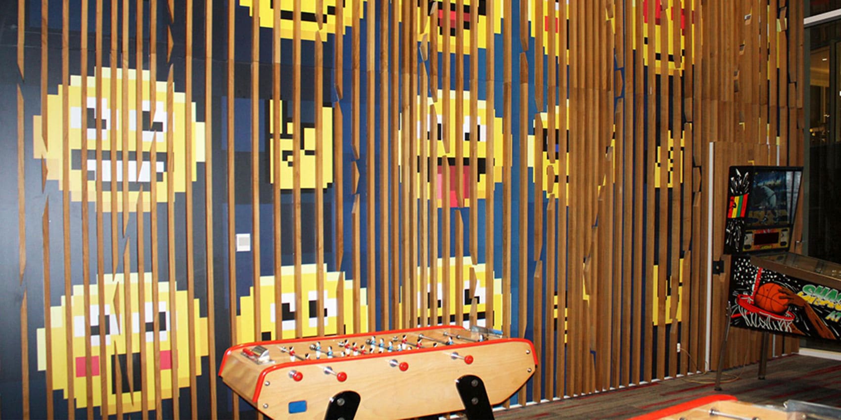 Mais au final, le résultat est là. Muzéo a réussi à faire d’une difficulté technique un atout artistique, les tasseaux créant des effets cinétiques sur la fresque du hall d’accueil et des effets de perspectives intéressants pour la Gaming Zone.