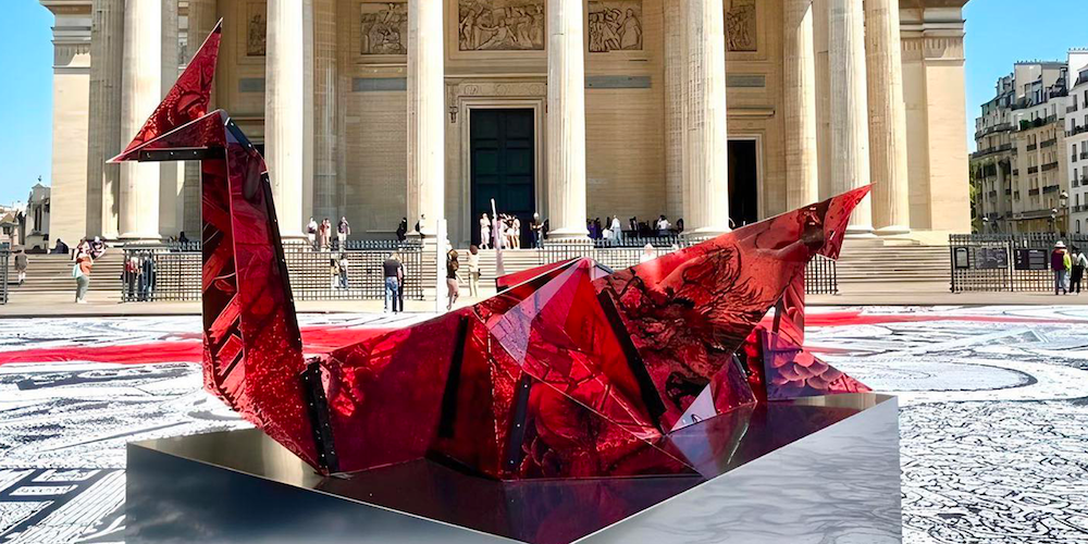 Un an après une fresque hommage à Joséphine Baker, Gwendoline Finaz de Villaine a de nouveau investi le parvis du Panthéon, à Paris. Dans le cadre du festival Le Quartier du Livre, qui s’est tenu début juin, l’artiste a mis en scène deux dragons géants en origami, sur fond de toile XXL, afin de célébrer l’amitié franco-chinoise. Une production gérée de A à Z par le groupe Elba, acteur historique de la PLV et de l’évènementiel retail haut de gamme, qui en profite pour affirmer sa diversification dans le milieu artistique.