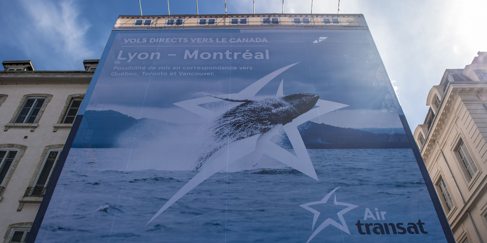 Air Transat est le plus important transporteur aérien canadien spécialisé dans les voyages vacances. Le visuel choisi était celui d’une baleine. Depuis mai, le bel animal s’ébat joyeusement sur les 268 m2 de bâche mis à sa disposition. À la réalisation, on retrouve l’imprimeur lyonnais Light Air, dont la presse HP Scitex de 5 mètres de laize permet d’imprimer ce visuel en quasi grandeur nature.