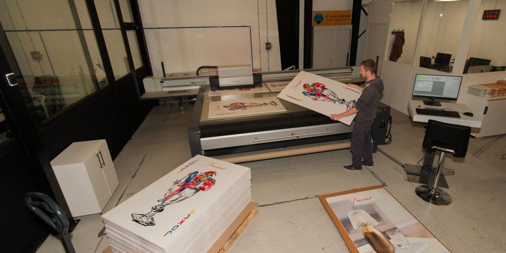Installé à Ivry-sur-Seine, l’imprimeur Scanachrome vient tout juste d’emménager dans de nouveaux locaux et profite de son agrandissement pour augmenter sa capacité de production. Créée en 1982, l’entreprise spécialisée dans la reproduction d’images pour les secteurs de la muséographie, du théâtre et du cinéma, de la Haute Couture et du retail vient d’acquérir une nouvelle imprimante jet d’encre LED UV Oryx 3 de swissQprint. « Nous avons souhaité renforcer notre équipement avec un système à plat pour accompagner notre croissance mais aussi nous ouvrir les portes de nouveaux marchés » explique Bruno Lambert, dirigeant associé de Scanachrome depuis 2016.