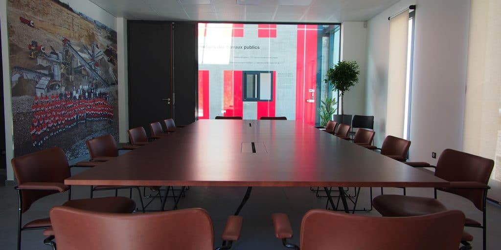 Les murs en béton des lieux, avec leurs effets graphiques, ont évidemment été conservés tels quels. « Ces effets matière avaient tout leur sens ici », confirme Jacques Villié. Créée sur-mesure, la banque d’accueil, en solid surface, reprend le mouvement d’une route. Le banc dans l’entrée vient d’une collection de mobilier urbain. La signalétique décorative s’inspire des empreintes laissées par les pneus des engins de chantier. Le rouge, couleur identitaire du groupe, se retrouve dans différents éléments, savamment dosé. Un pêle-mêle d’images issues des archives de l’entreprise humanise les lieux, tout comme la photo de famille grand format installée dans la salle de réunion, et les visuels de chantiers au premier étage. Pour rendre plus glamour le bulldozer, un mur végétal de plusieurs mètres de haut habille l’entrée, procurant un vrai sentiment de bien-être. Une belle image pour une entreprise de travaux publics.